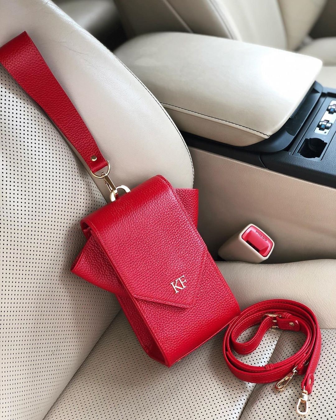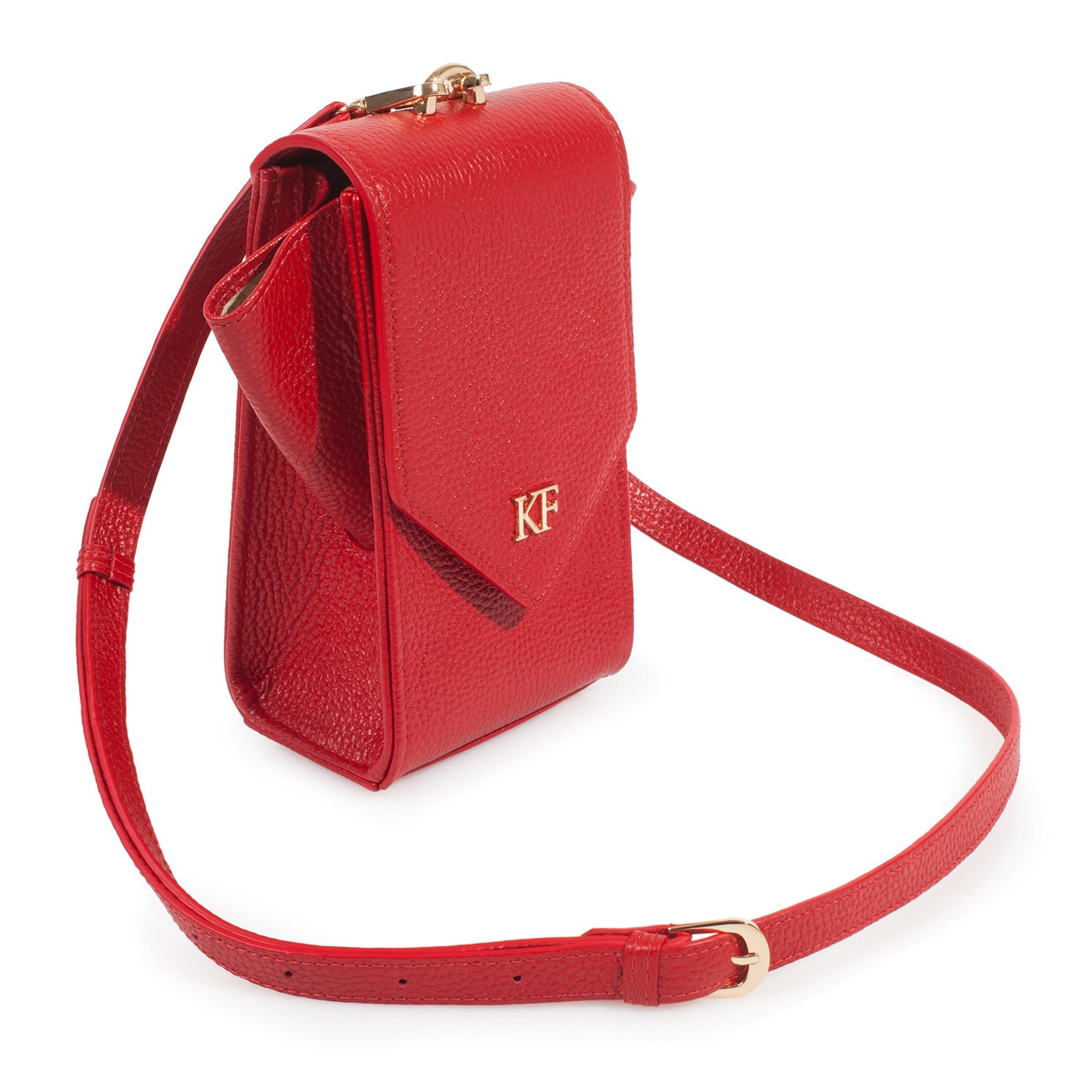 Red genuine leather woman crossbody bag from ukrainian designer Katerina Fox. Fashionable and elegant modern bag KF for bright girls and women. This bag is able to attract attention and highlight your exquisite taste. All accessories for Katerina Fox bags makes the same factory as for Michael §¬ors, Calvin Klein, DKNY and other famous brands.The internal space of a bag is equipped with one spacious compartment, four patch pockets for cards. The bag is closed on the button-magnet. The bag has a short removable handle on wrist.The length of the strap is adjustable. The kit also includes a storage bag.