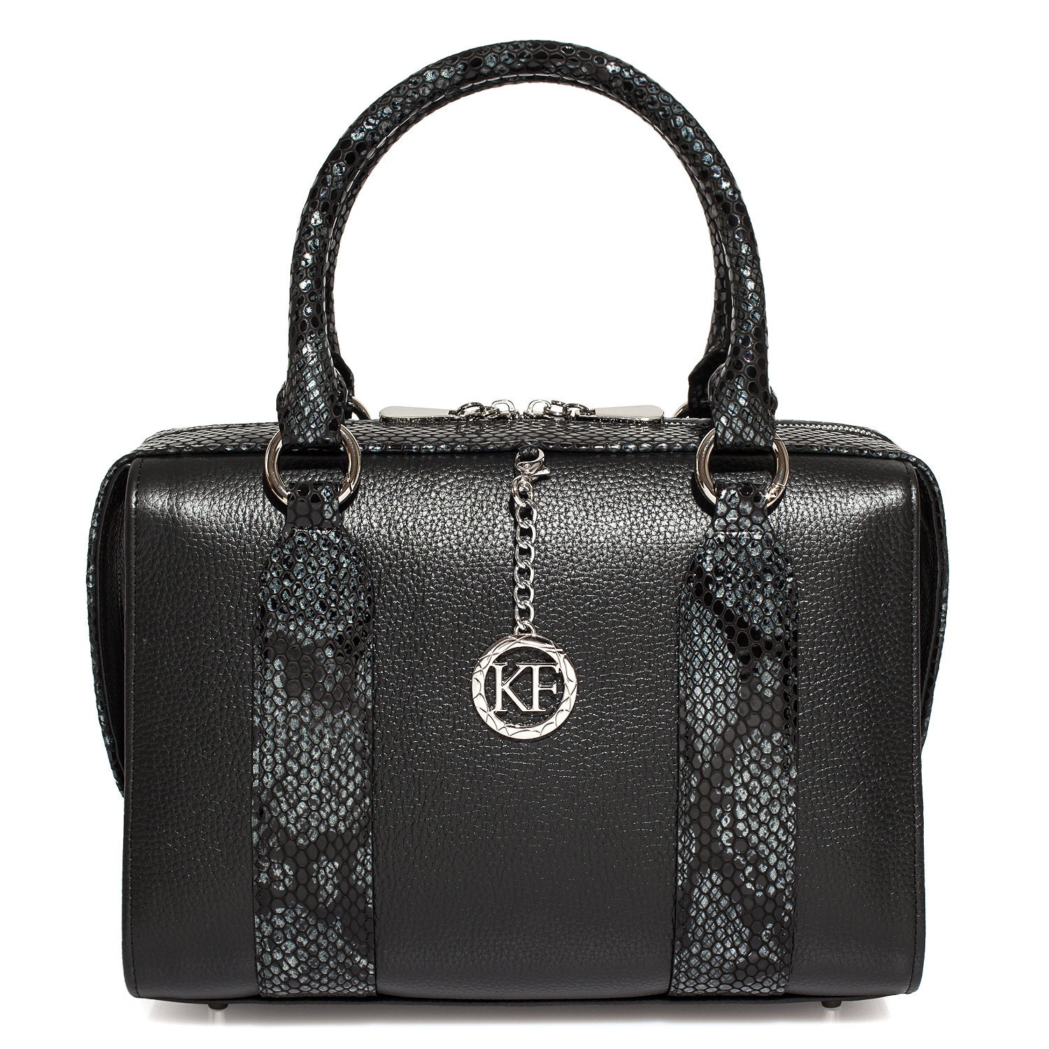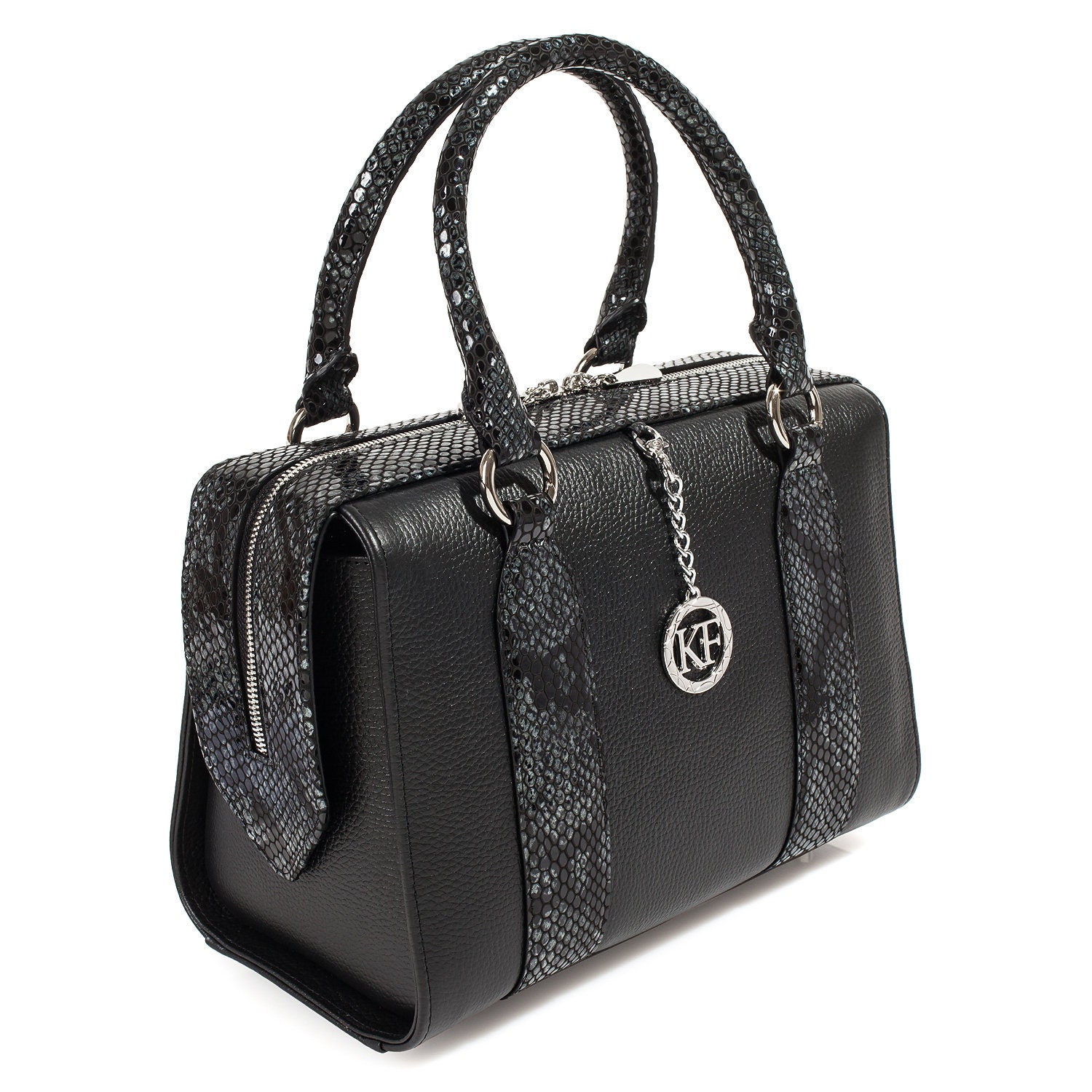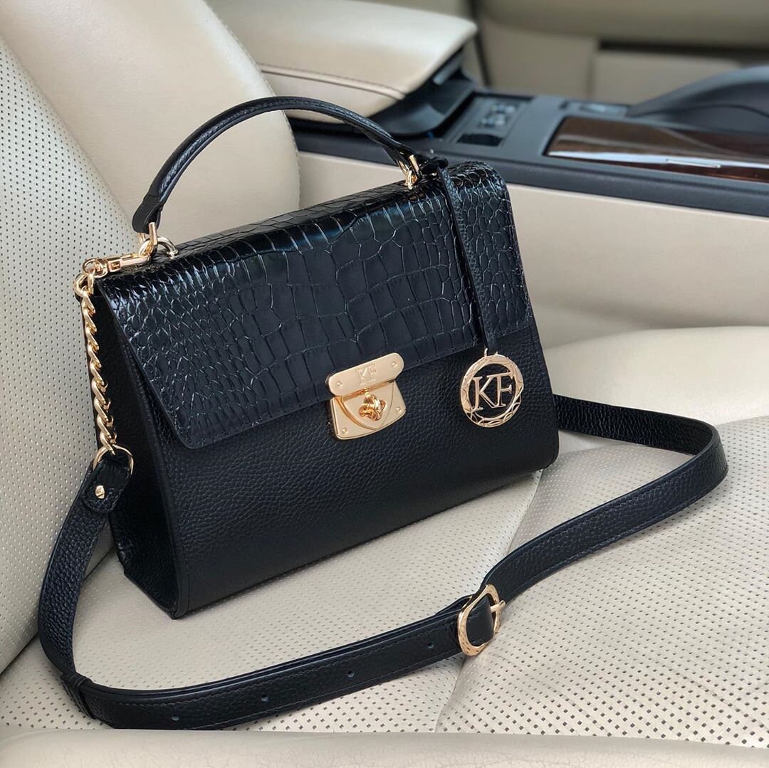 Black genuine leather handbag from ukrainian designer Katerina Fox. This model is designed for women who appreciate the sleek design combined with functionality and comfort. High-quality and reliable hardware ensure long service bags.The internal space of a bag is equipped with one spacious compartment and one patch-pocket and one zipper pocket. The bag is closed with a zipper. The bottom of the bag is protected with metal legs. The kit also includes a storage bag.