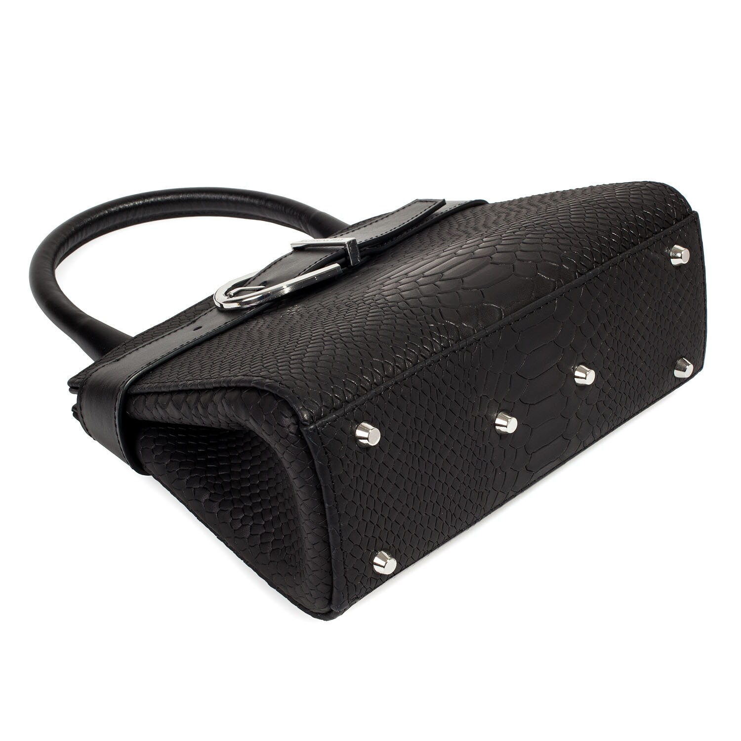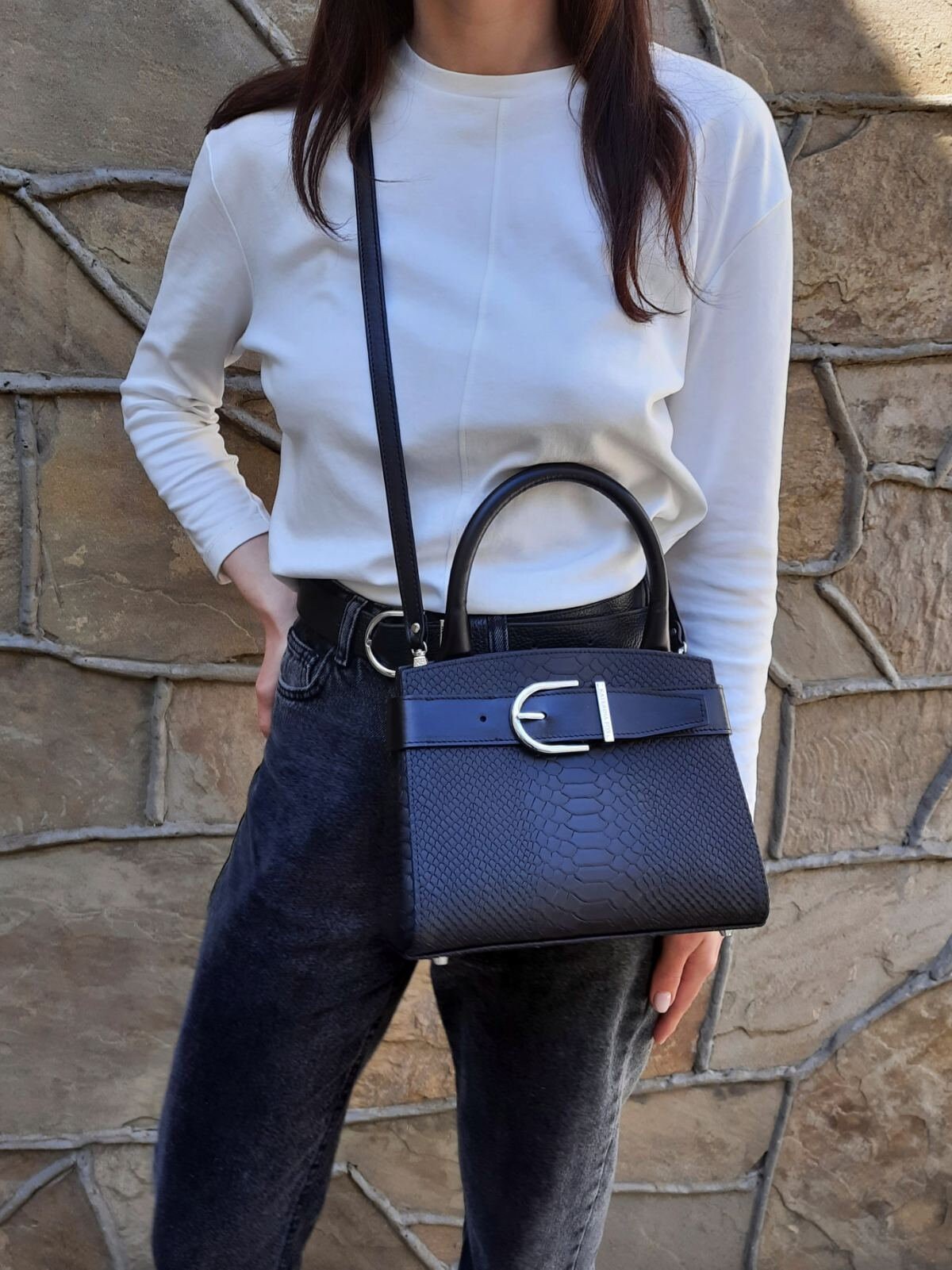 Women's leather bag made of genuine leather, hardware with galvanic coating and microfiber lining. The internal space of a bag is equipped with three compartments, one compartment and two side pockets, one with a zipper. §³loses with 3 magnet buttons. The bottom of the bag is protected with metal legs. There is a long handle that allows you to wear the bag on the shoulder. The kit also includes a storage bag.