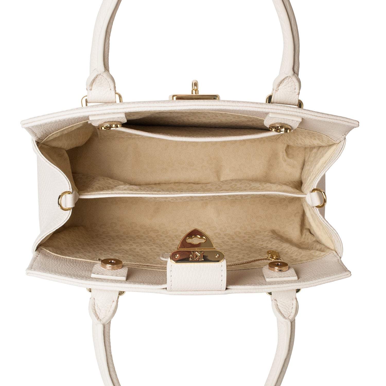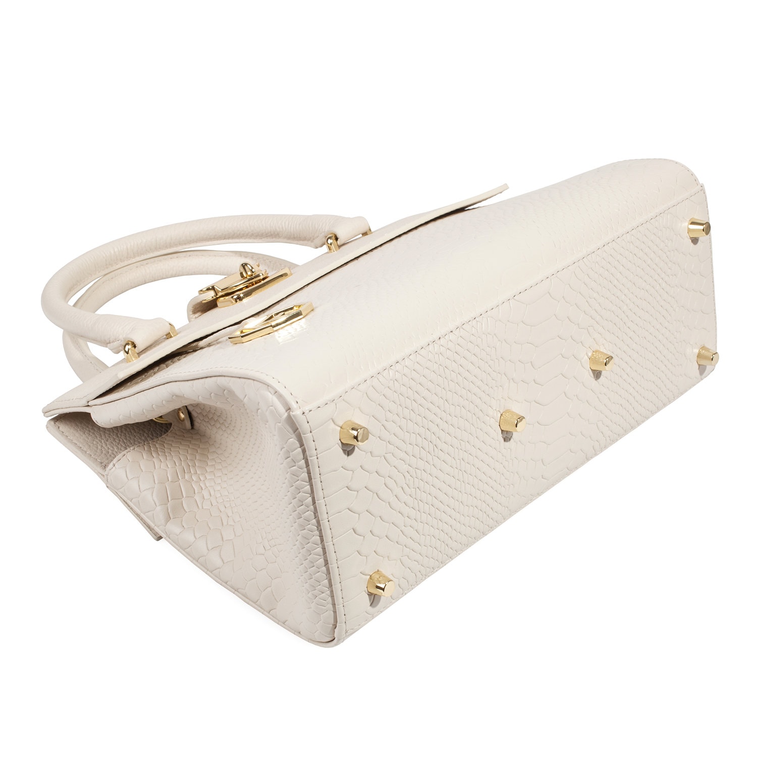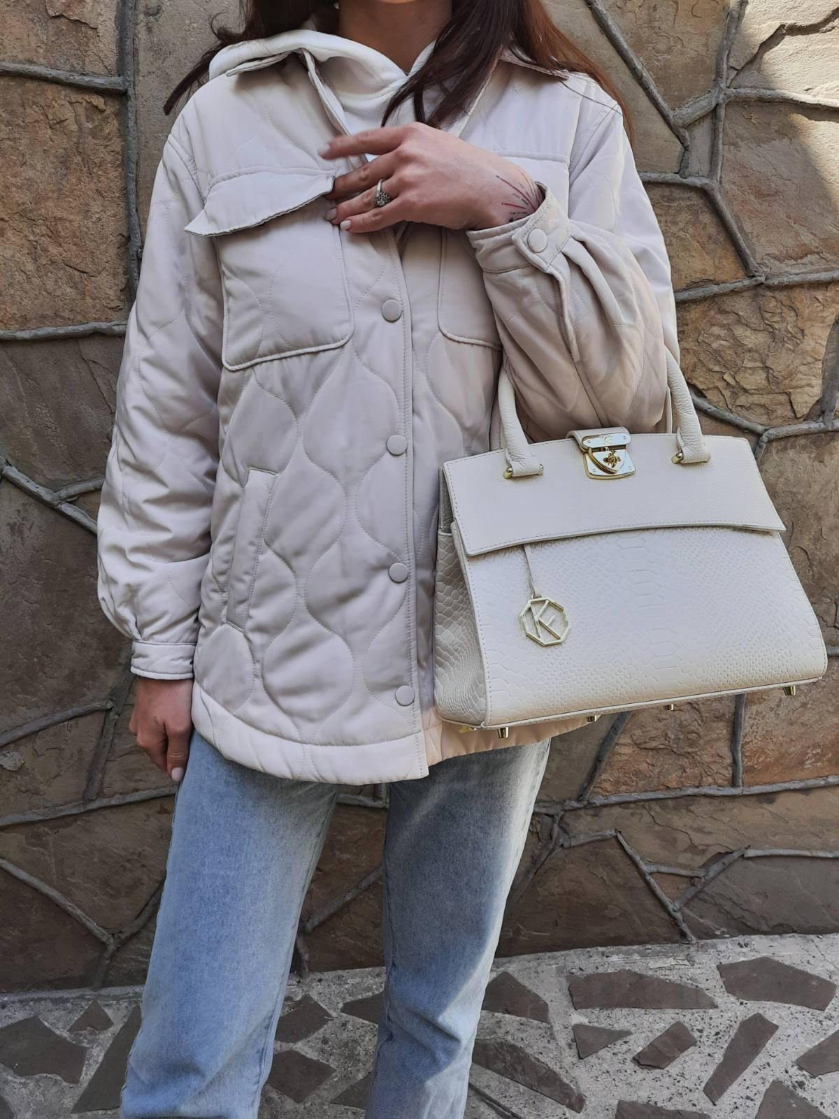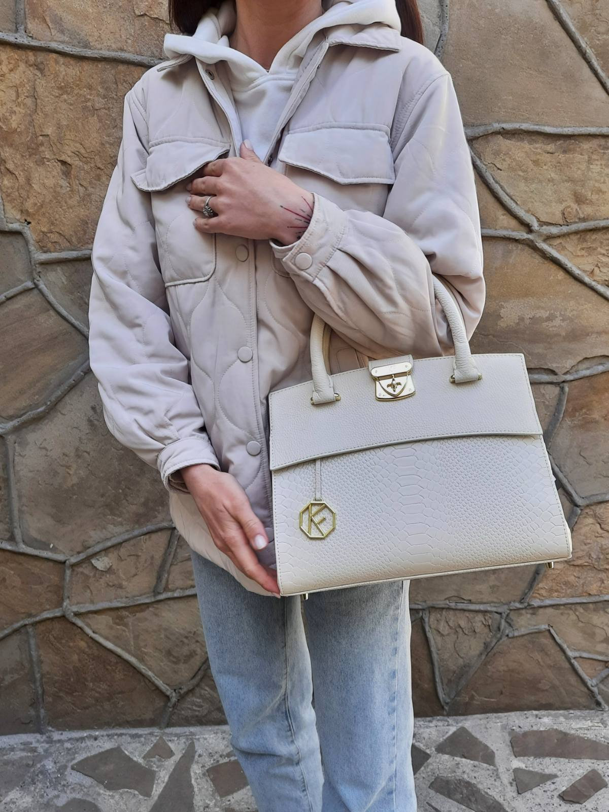 Women's leather bag made of genuine leather, hardware with galvanic coating and microfiber lining. The internal space of a bag is equipped with three compartments, two compartments and two side pockets, one of them with a zipper. It closes with a lock and two magnet buttons. The bottom of the bag is protected with metal legs. There is a long handle that allows you to wear the bag on the shoulder. The kit also includes a storage bag.